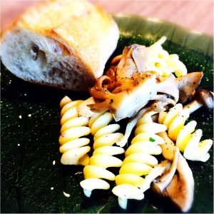 次に前菜ですが、この日はショートパスタときのこのマリネでした。