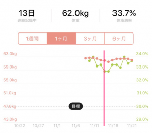 結構貝の量は食べてしまったのですが、翌朝になると二人とも体重が減っているではありませんか!笑(ピンクの線)